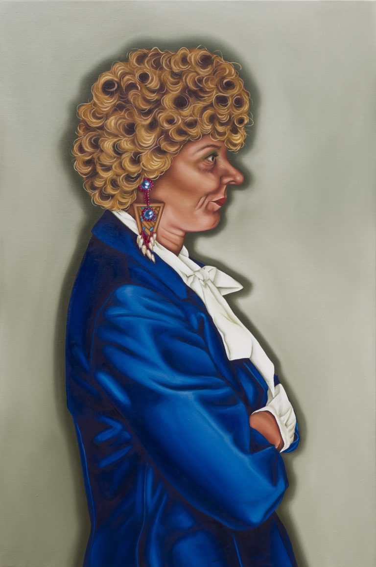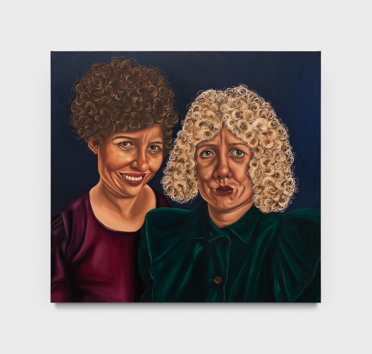 The first act in Pfull’s practice is peculiar. She ages herself with makeup, puts on wigs and dresses up as the characters she wants to reproduce, namely 1980s suburban housewives. Mimicking particular expressions, idiosyncrasies and postures, she feeds the documentation into smoothly surfaced paintings. Describing the process she says, ‘I think I have similar impulses to writers and actors, of making up stories and involving myself in a character’s life. I am fascinated with performance and mannerisms which can provide a whole backstory to the person they portray.’