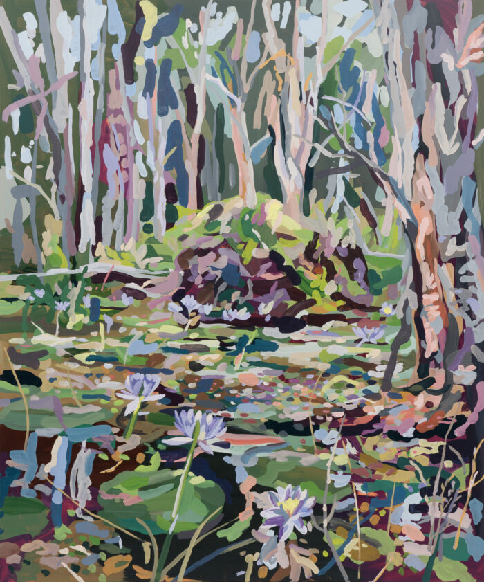 Oliver Watts’ paintings are rich in allusions from popular culture to the long history of painting and its various genres (portraiture, landscape, still life etc). His images borrow, steal and reuse visual culture. His work is contemporary in the way everything is equivalent and brought into play. He often stages reenactments of literature or art history using actors and other collaborators. The artifice of the image is also embodied by his gestural style of painting, mosaic-like and languid. Permeating his works is the Australian landscape, the heat of the sun, the crunch of the forests and the deafening sound of cicadas. Watts’ paintings are baroque, rich, seductive and complex.