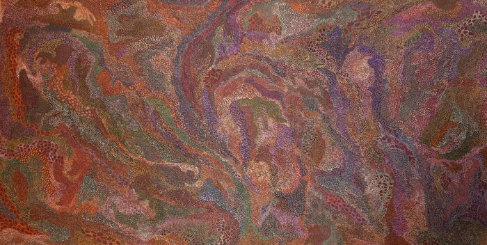 Based in Roebourne, a small town in Western Australia’s Pilbara region of the north-west of the state, the Yinjaa-Barni artists create deeply personal works of collective memory, rendering the wildflowers, river systems and landforms of their country onto canvas. It is a community group consisting of predominantly family members and has become a very busy and lively centre. Within the first few months of the formation of the group around ten of the artists entered works in the 2006 Cossack Art Award. They received five Highly Commendable awards and a Category Winner by group member Jill Tucker.